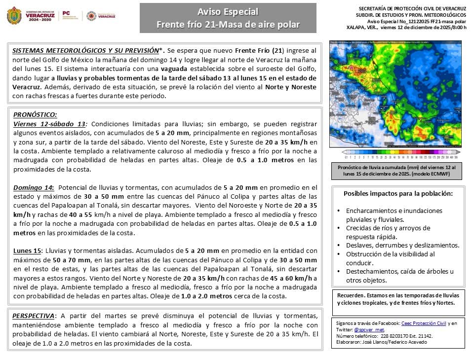12 de diciembre de 2025. Xalapa, Ver.- Este viernes a través de su conferencia semanal, el Comité de meteorología de la Secretaría de protección Civil de Veracruz dio a conocer que se espera que nuevo Frente Frío (21) ingrese al norte del Golfo de México la mañana del domingo 14 y logre llegar al norte de Veracruz la mañana del lunes 15.