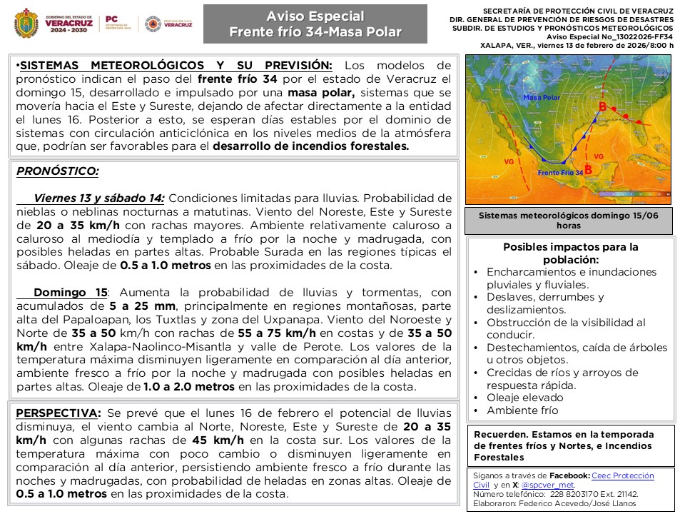 Xalapa, Ver. 13 de febrero de 2026. Autoridades meteorológicas emitieron un Aviso Especial ante el ingreso del frente frío número 34, el cual recorrerá el estado de Veracruz el próximo domingo 15 de febrero, impulsado por una masa de aire polar.