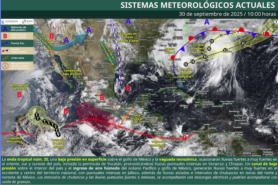 El organismo también detalla que se prevén lluvias puntuales intensas en Veracruz y Chiapas; muy fuertes en Oaxaca, Tabasco, Campeche, Yucatán y Quintana Roo; fuertes en Puebla y Tlaxcala; así como chubascos en Tamaulipas y San Luis Potosí, debido a la Onda Tropical número 35, se espera que esta dé origen a una zona de baja presión con probabilidad de desarrollo ciclónico, al sur de las costas de Oaxaca y Guerrero en los próximos días.