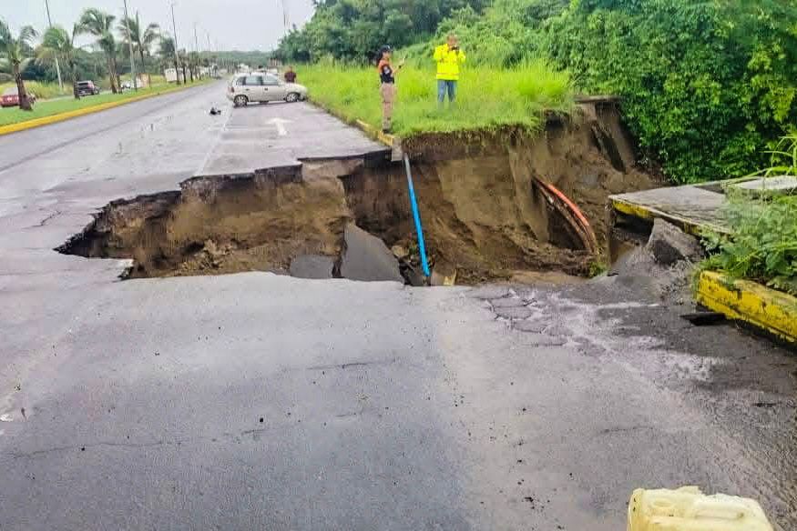 08 de octubre de 2025. Alvarado, Ver.- Por las intensas lluvias que no han cesado desde ayer, se generó un gran socavón este miércoles en la carretera hacia Antón Lizardo, sobre la Riviera Veracruzana, que afecta fuertemente la circulación vial.