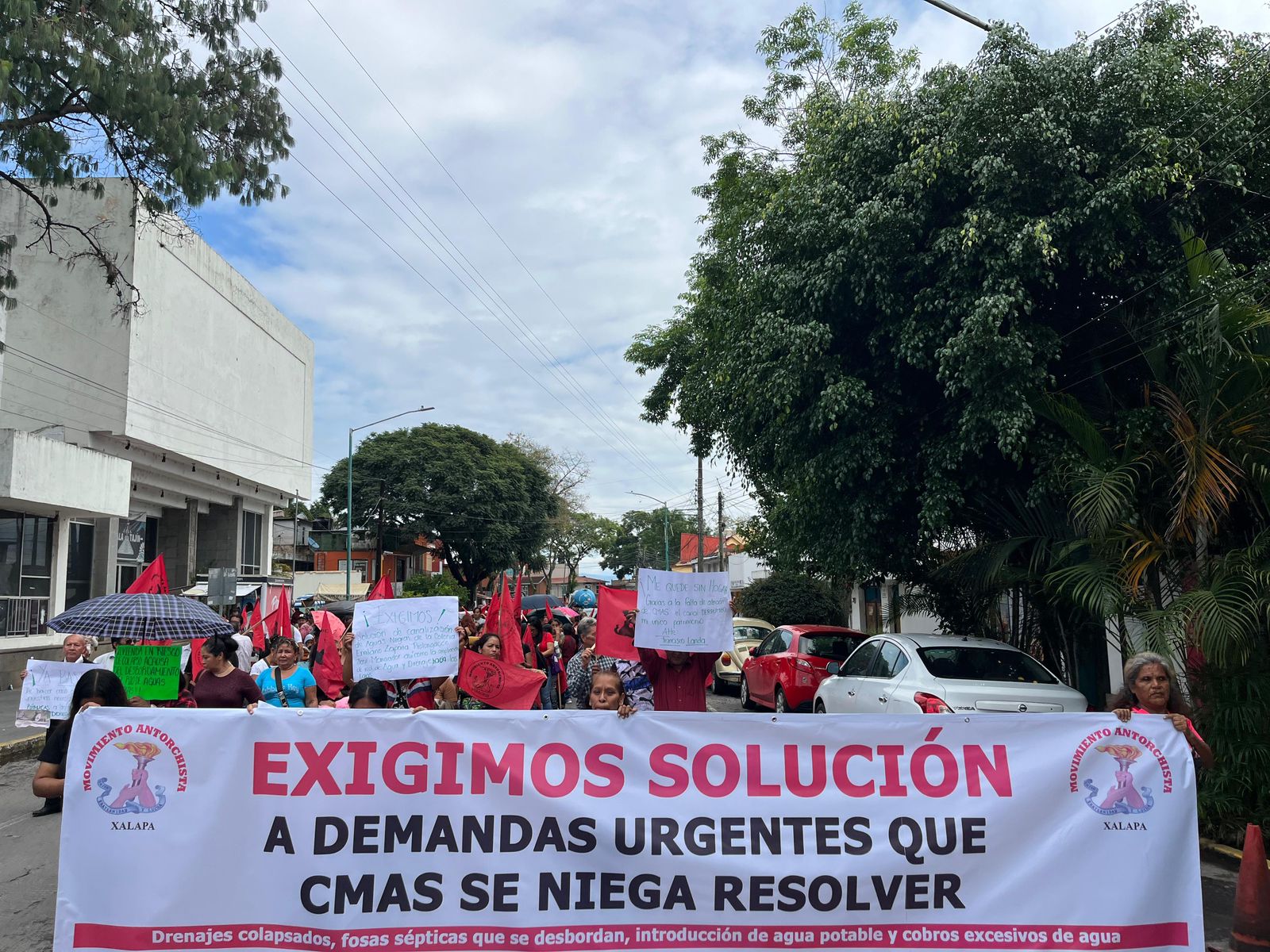 EL Movimiento Antorchista, marchan de las instalaciones de la Comisión Municipal de Agua y Saneamiento (CMAS) en la avenida Miguel Alemán hasta el Ayuntamiento de Xalapa en el centro de la ciudad, para exigir que la CMAS resuelva problemas de drenajes colapsados, socavones provocados por drenajes a cielo abierto que amenazan las viviendas, ollas de drenaje por donde están brotando las aguas negras, cobros excesivos de recibo de agua, introducción de agua potable en las colonias: Unión Antorchista, Humberto Aguirre Cruz y ampliación Fraternidad en la zona Tronconal.
