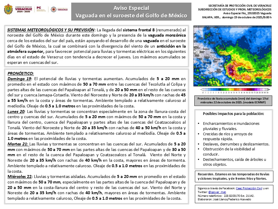 Lunes 20 lluvias de 5 a 20 mm y máximos de 50 a 70 mm en zona costera-central y cuencas del sur. Viento de 20 a 35 km/h, rachas de 40 a 50 km/h. Oleajes de 0.5 a 1.0 metros y ambiente cálido al mediodía martes 21 lluvias concentradas en las cuencas del sur, con acumulados de 5 a 20 mm, máximos de 50 a 70 mm en partes altas del Papaloapan, y de 30 a 50 mm en cuencas del Coatzacoalcos al Tonalá.}