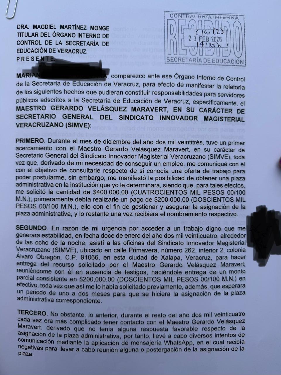 Una denuncia formal presentada ante la Fiscalía General del Estado y testimonios de personas afectadas revelan presuntas irregularidades atribuidas a Gerardo Velázquez Maravert, secretario general del Sindicato Innovador Magisterial Veracruzano…