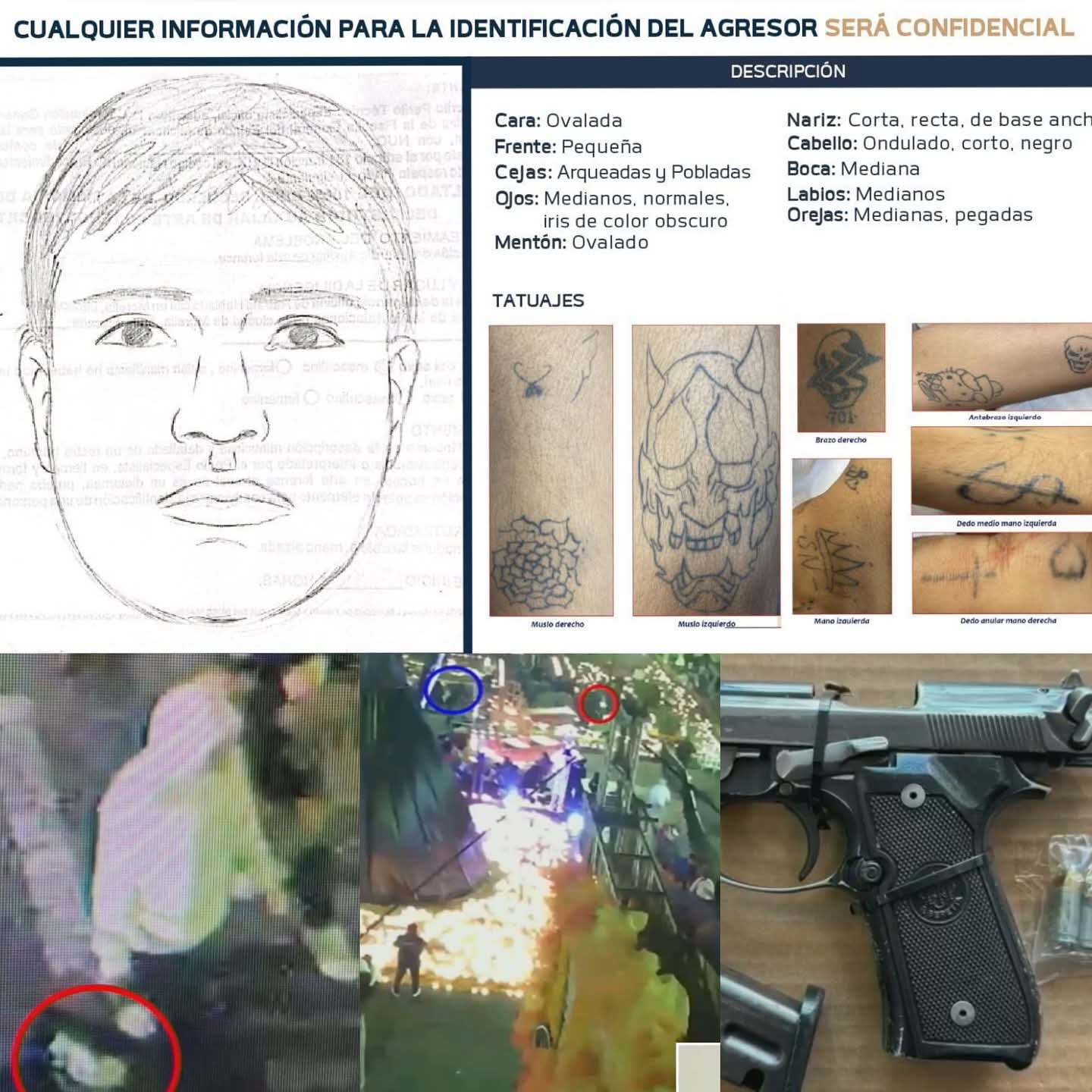 Durante la presentación, la Fiscalía mostró imágenes de tatuajes distintivos del atacante, entre ellos una corona con las letras “SN”, un signo de pesos, una cruz, un corazón, una Hello Kitty y una calavera.