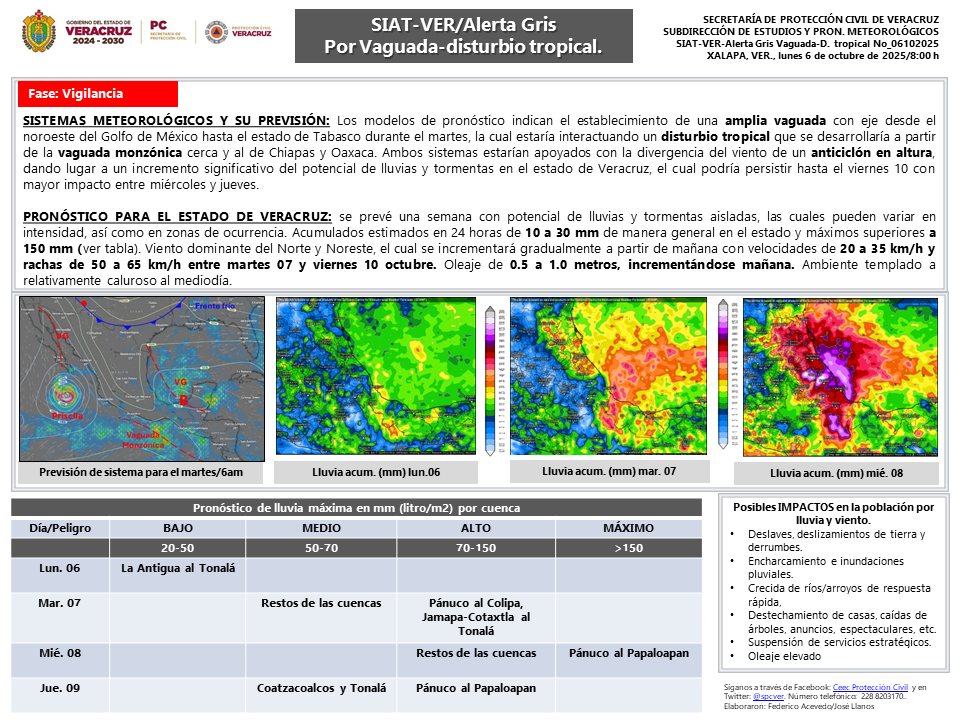 06 de octubre de 2025. Xalapa, Ver.- Este lunes el Comité de Meteorología de la Secretaría de Protección Civil de Veracruz dio a conocer en su boletín diario que se mantiene la Alerta Gris SIAT-VER en fase de vigilancia debido a un Vaguada ubicada en el Golfo de México, la cual estaría interactuando con un Disturbio Tropical con presencia en el Golfo de Tehuantepec entre los estado de Oaxaca y Chiapas.