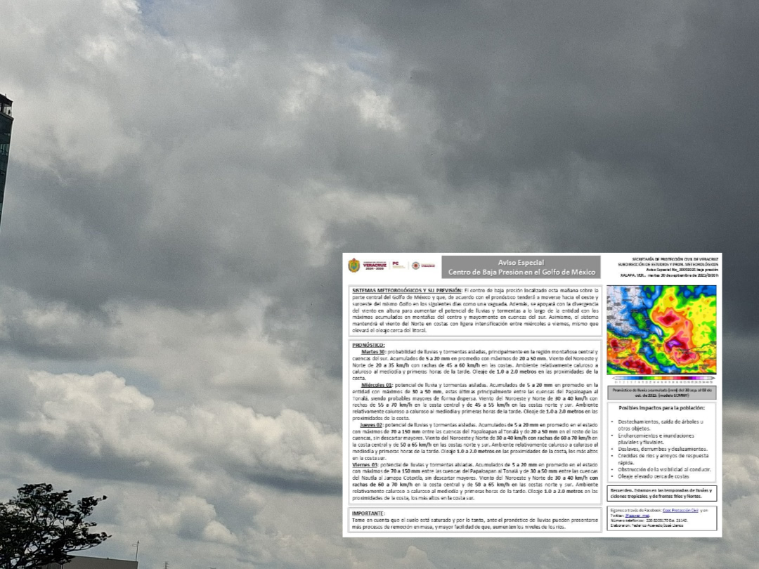30 de septiembre de 2025.Xalapa, Ver.- Este martes el Comité de Meteorología de la Secretaría de Protección Civil de Veracruz emitió un Aviso Especial por la presencia un sistema de baja presión localizado sobre la parte central del Golfo de México, de acuerdo con los pronósticos este sistema tendrá que moverse hacia el oeste y suroeste del mismo Golfo en los siguientes días como Vaguada.