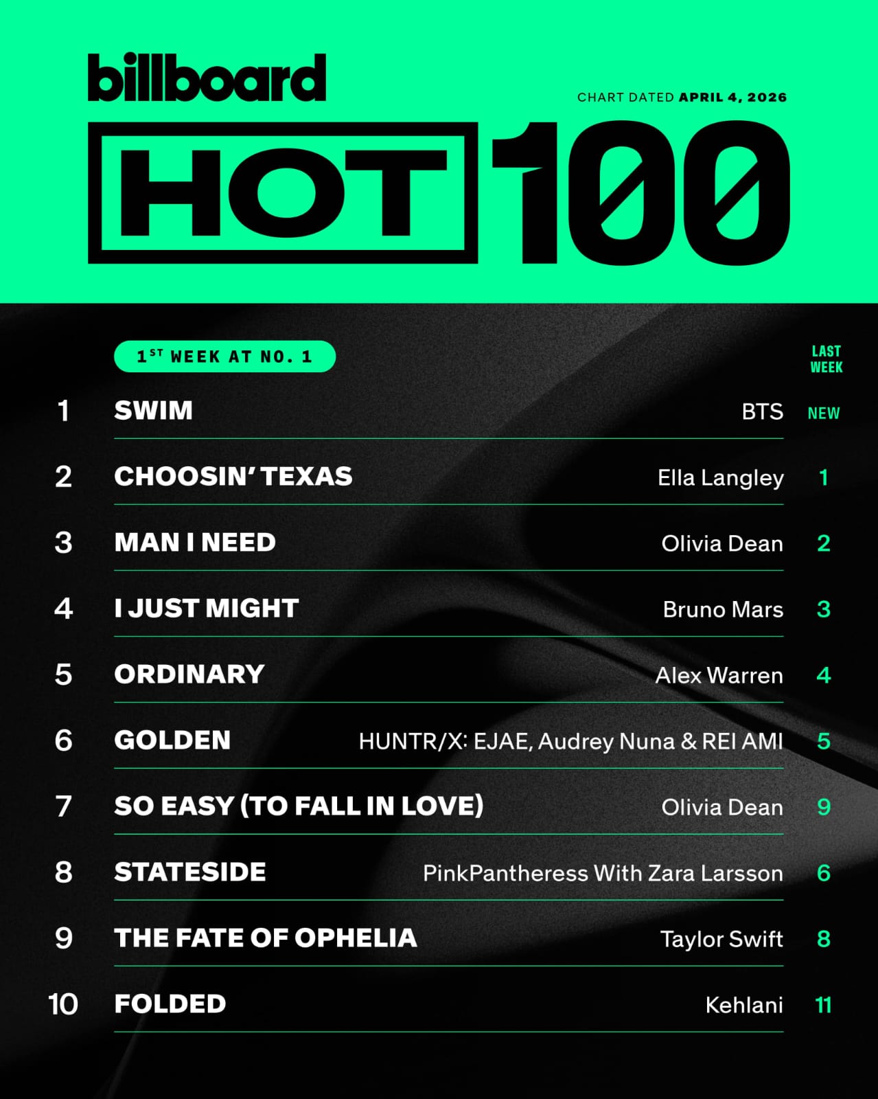 30 de marzo 2026, EE.UU.- La boy band surcoreana ha roto más récords con su álbum de regreso Arirang, en la popular lista de éxitos de Billboard apareció en el número 1 con la canción Swim en el Hot100, este albúm ocupó ocupo la posición 1 de Billboard200 durante esta semana. Con estos resultados BTS ha logrado tener seis canciones en el número 1 de estas listas de éxito mundial.