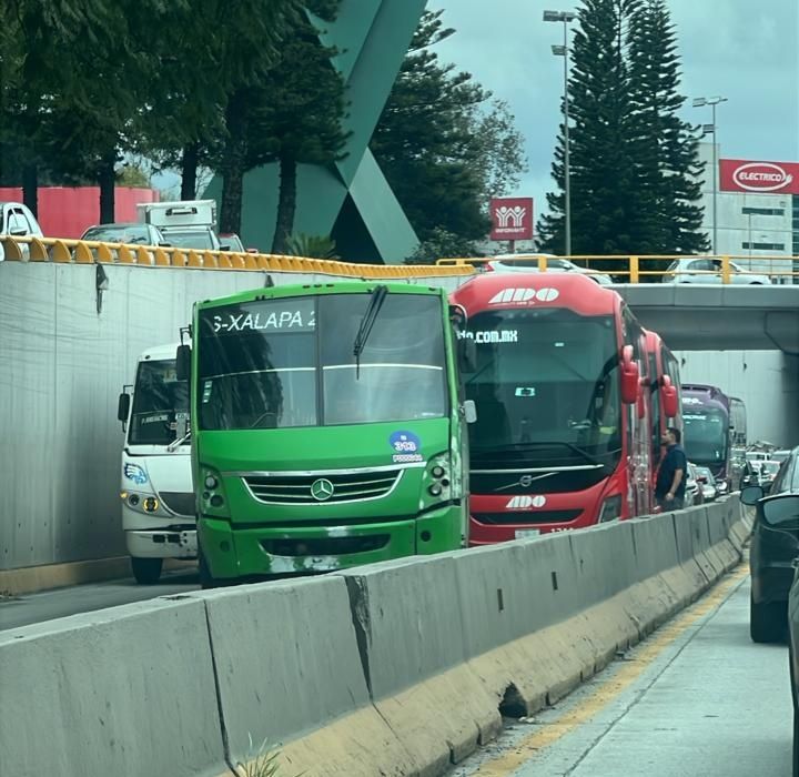 22 de diciembre del 2025. Xalapa, Ver.- La tarde de este lunes 22 de diciembre, se registró un percance vial sobre el distribuidor Araucarias, en los carriles con dirección hacia Las Trancas, involucrando a dos unidades de transporte de pasajeros.
