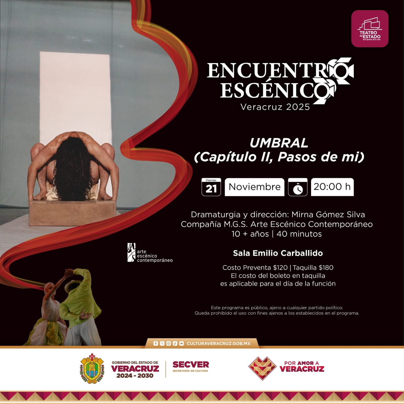 de programas como FONCA y PECDA Veracruz. La nueva versión de Umbral es producida por MGS Arte Escénico Contemporáneo y El Patio estudio independiente.La función de Umbral será en la sala Emilio Carballido del Teatro del Estado en Xalapa, tendrá una duración aproximada de 45 minutos y se llevará a cabo este 21 de noviembre de 2025 a las 20:00 horas, con acceso al público desde las 19:30.