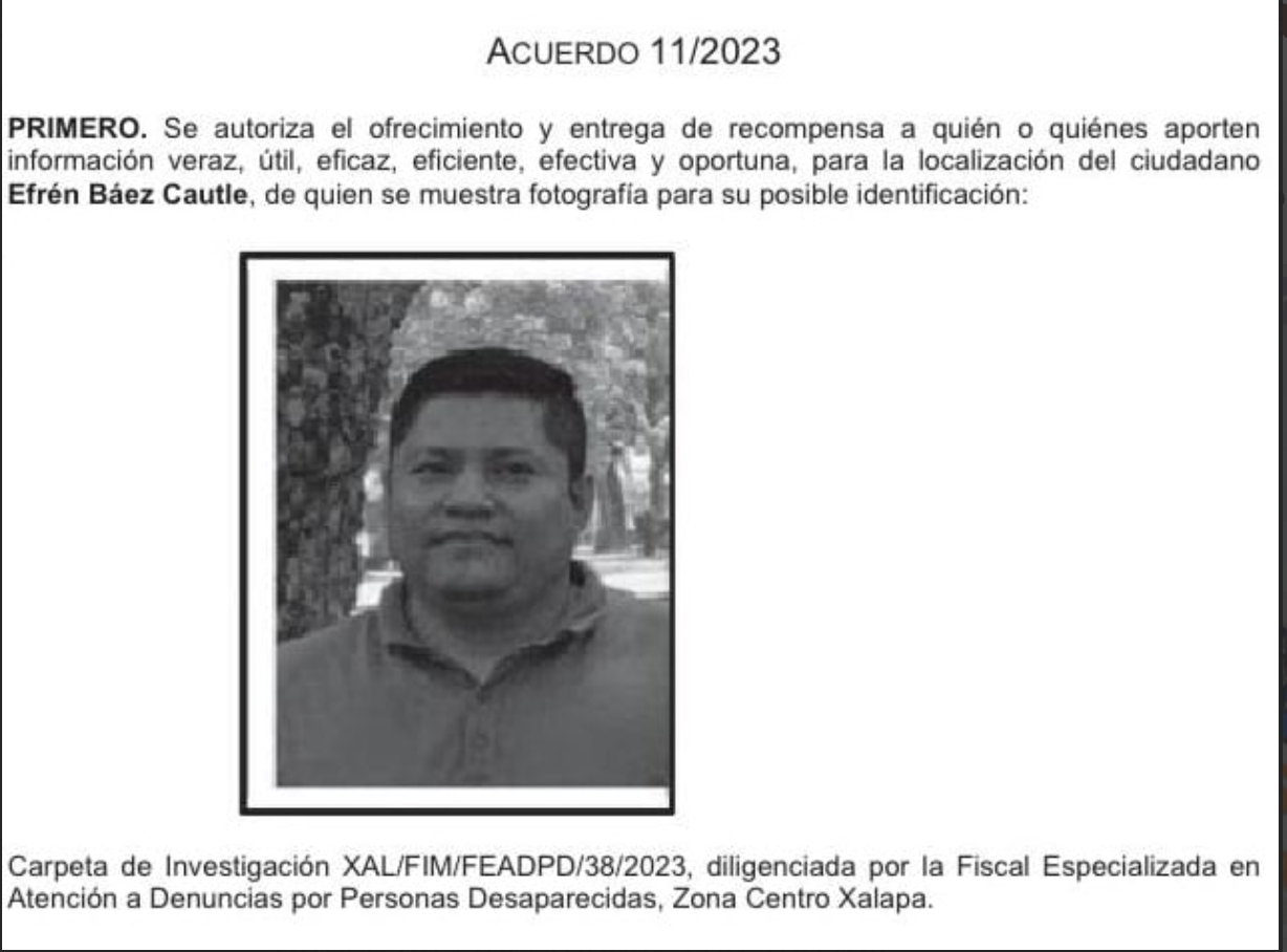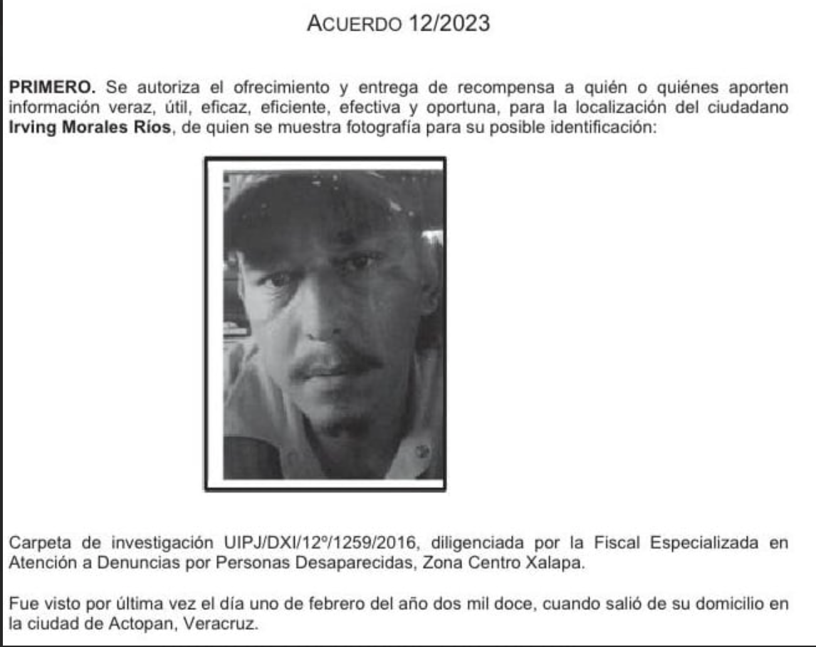 Uno de los masculinos que busca la FGE es Irving Morales Ríos, quien desapareció en 2012 y fue visto por última vez en Actopan, Veracruz, el 1 de febrero cuando salió de su casa. Y Efrén Baéz Cautle, fue visto por última vez en Cosamaloapan el 3 de febrero del 2022.