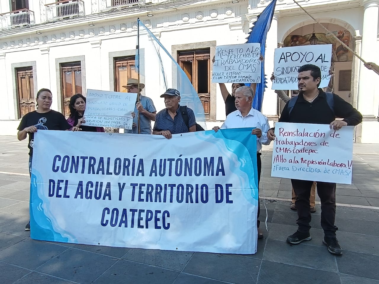 6 de septiembre del 2025.- Integrantes de la Contraloría Autónoma del Agua y Territorio de Coatepec denunciaron el despido injustificado de 15 trabajadores sindicalizados de la Comisión Municipal de Agua y Saneamiento (CMAS), por lo que se manifestaron frente al Palacio Municipal de Coatepec.
