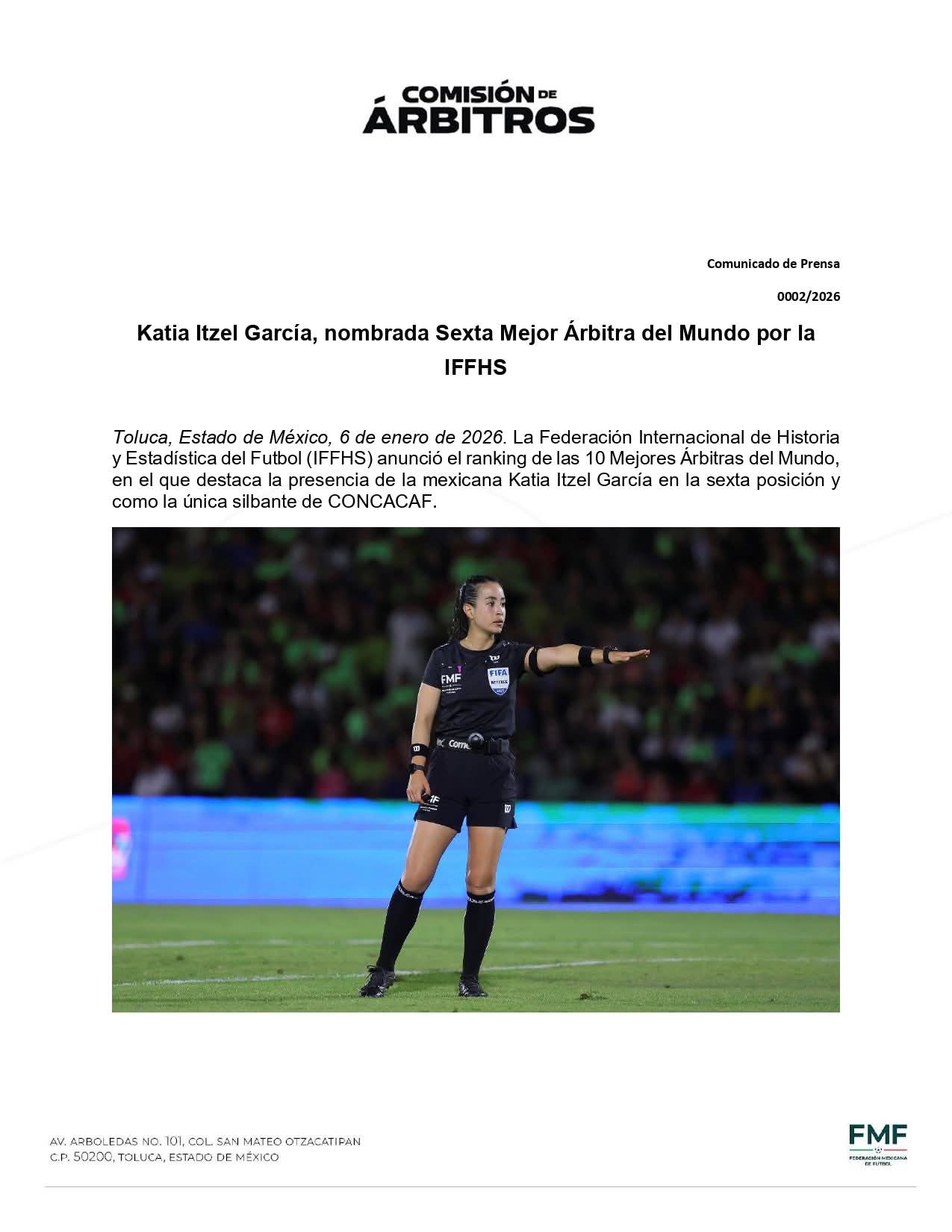 Ciudad de México.- La árbitra mexicana Katia Itzel García fue incluida en el Ranking Mundial de la Federación Internacional de Historia y Estadística del Fútbol (IFFHS) como la sexta mejor árbitra del mundo, un reconocimiento a su trayectoria y desempeño en el arbitraje internacional, así lo dio a conocer la Federación Mexicana de fútbol (FEMEXFUT) este martes.