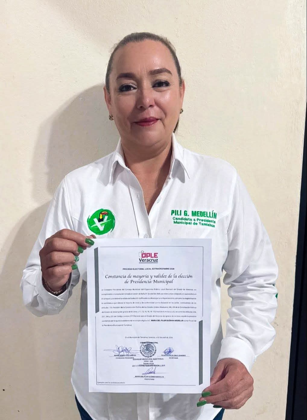 El Organismo Público Local Electoral de Veracruz (OPLE) otorgó la constancia de mayoría a María del Pilar Guzmán Medellín, acreditándola oficialmente como presidenta municipal electa de Tamiahua.